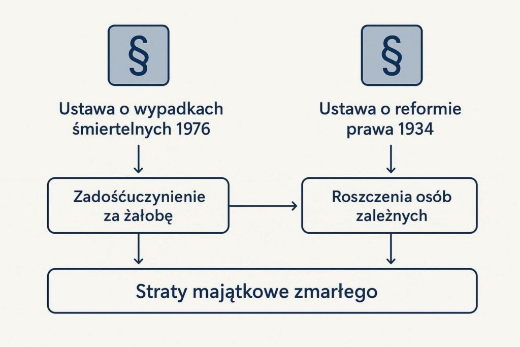 Przy takich sprawach kluczowe są dwie ustawy: Ustawa o Wypadkach Śmiertelnych z 1976 r. (The Fatal Accident Act 1976) i Ustawa o Reformie Prawa (Postanowienia Różne) z 1934 r. (The Law Reform (Miscellaneous Provisions) Act 1934). Pierwsza pozwala bliskim domagać się zadośćuczynienia, w tym świadczenia za żałobę (bereavement award) i roszczeń osób zależnych (dependency claim). Druga umożliwia majątkowi zmarłego odzyskanie części strat, do których zmarły miał prawo za życia (np. ból i cierpienie, jeśli nie zmarł od razu, oraz utracone zarobki).