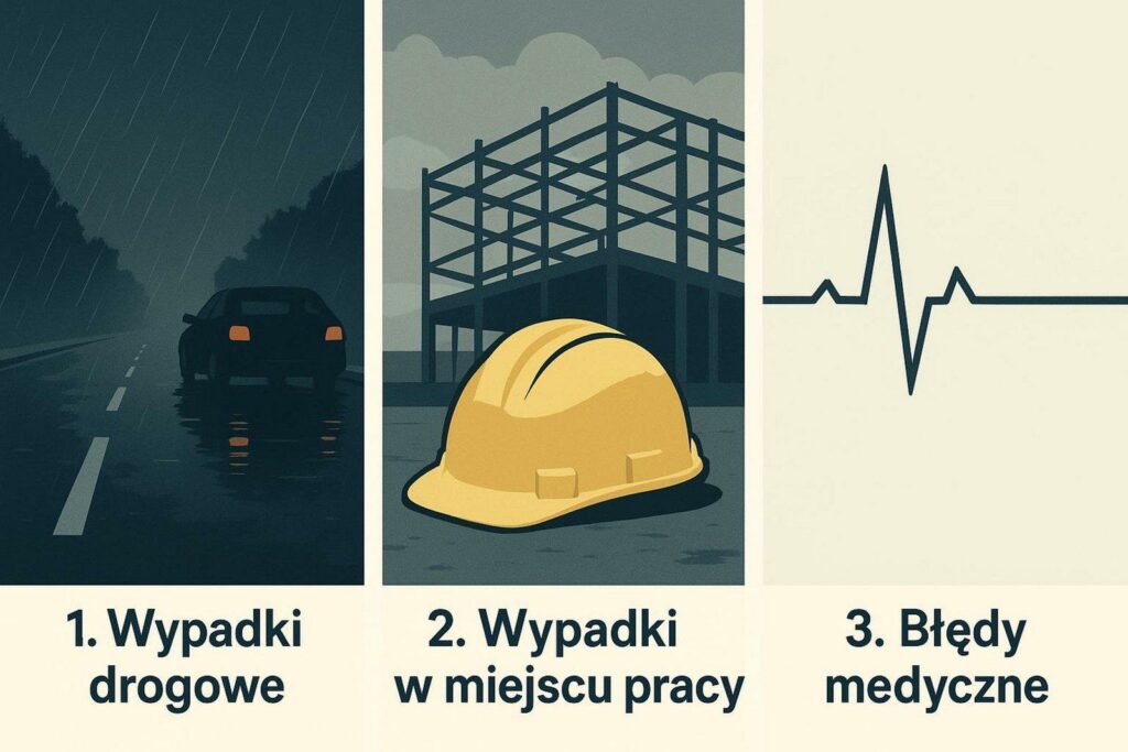 Wypadki komunikacyjne: Odpowiada zwykle inny kierowca. Częste przyczyny: brak obserwacji, prędkość, telefon, używki. Brak pasów nie wyklucza roszczenia, jeśli wina leży po drugiej stronie. Ucieczka sprawcy lub brak polisy oznacza roszczenie do MIB. Raporty policji i koronera mają duży wpływ na sprawę cywilną.